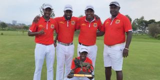 Kenya's national golf team pose with the Africa Golf Confederation Region 4 Golf Championship trophy on June 10, 2023 in Addis Ababa.
