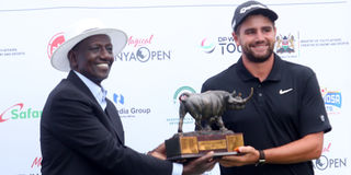 President William Ruto presents the Magical Kenya Open Golf tournament trophy to the winner Jarvis Casey of South Africa at Karen Country Club with on February 22, 2026.
