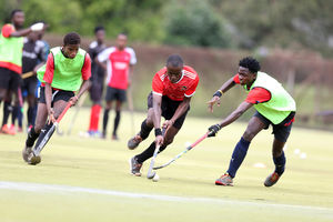 Kisumu Youngstars Hockey Club players stretch during a training session at Kisumu Day grounds in Kisumu.
