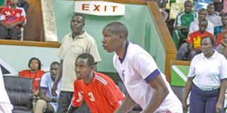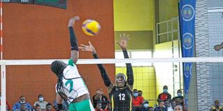 Prison’s Lydia Maiyo (right) in action against KCB during a past league play-off match at Makande Hall in Mombasa.