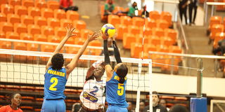 Rwanda's Benitha Mukandayiseng (left) spikes the ball as Kenya's Veronicah Adhiambo (centre) and Trizah Atuka attempt to block during their African Nations Championships Group B match at Palais Polyvalet Des Sports (Paposy) arena on August 16, 2023.