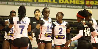 Malkia Strikers players celebrate a point during the Africa Nations Championship final match against Egypt in Yaounde, Cameroon on August 24, 2023. Kenya won 3-0.