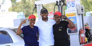 Vivo Energy Kenya Commercial Manager Mark Senteu (centre) with Tinashe Gatimu (left) and Caroline Gatimu ahead of the second round of the Shell Autocross Championship set for Twisty 2 Track on February 23, 2025.