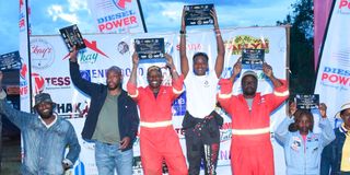 Gitau Munene third (right), 14 years old, who drive a Land Rover, and won the Super Expert category at the Diesel Power Kaptagat (4 by 4), Off-Road Challenge National Championships Round One. Amin Mohammed second (left), who drives a Range Rover, emerged second, Hudson Khasiani second (right), who also competed in a Range Rover, finished third, together with their co-drivers, display their awards..