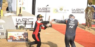 Sebastien Ogier (left) and his navigator Julien Ingrassia celebrate their win during the award ceremony of the WRC Safari Rally in Naivasha on June 27,2021