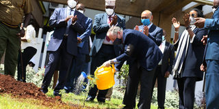 Jean Todt, the International Automobile Federation (FIA) President waters a tree during the launch of the WRC Safari Rally Greening Legacy Project at the Moi International Sports Centre, Kasarani on November 24, 2020.