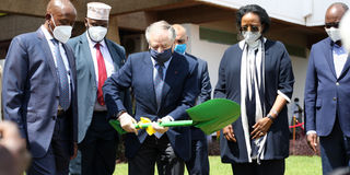 Jean Todt, the International Automobile Federation (FIA) President plants a tree during the launch of the WRC Safari Rally Greening Legacy Project at the Moi International Sports Centre, Kasarani on November 24, 2020.