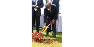Transport Cabinet Secretary James Macharia plants a tree during the launch of a tree-planting initiative by the WRC Safari Rally at Kasarani on November 24, 2020.