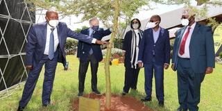 From left to right: Safari Rally CEO Phineas Kimathi, International Automobile Federation President Jean Todt, Sports Cabinet Secretary Amina Mohamed, Transport Cabinet Secretary James Macharia and Sports Chief Administrative Secretary Hassan Noor Hassan during the launch of a tree-planting initiative at Kasarani on November 24, 2020.