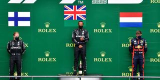 Winner Mercedes' British driver Lewis Hamilton (centre) celebrates on the podium next to second placed Mercedes' Finnish driver Valtteri Bottas (left) and third placed Red Bull's Dutch driver Max Verstappen after the Belgian Formula One Grand Prix at the Spa-Francorchamps circuit in Spa on August 30, 2020.