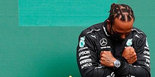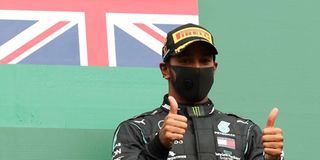 Mercedes' British driver Lewis Hamilton gestures on the podium after winning the Belgian Formula One Grand Prix at the Spa-Francorchamps circuit in Spa on August 30, 2020.