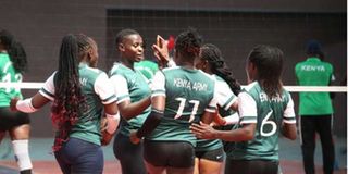 Kenya Army ladies celebrate a point during their Kenya Volleyball League matches at Ulinzi Sports Complex on May 17, 2024.