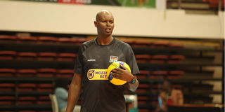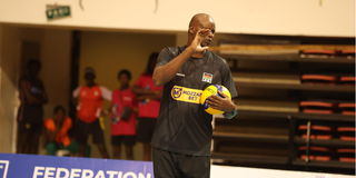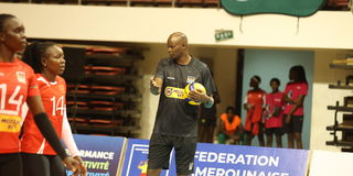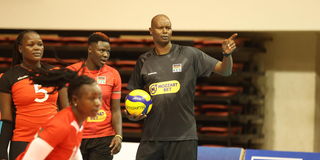 Malkia strikers coach Paul Bitok gives instructions during their morning training session on August 19, 2023 at Palais Polyvalet des Sports (Paposy) Arena ahead of African Nations Championships match against Morocco.