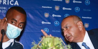 International Motorsports Federation (FIA) vice president Surinder Thatthi speaks with Christian Gakwaya of Rwanda Automobile Club during the opening day of the Sports Regional Congress hosted by the Kenya Motor Sports Federation at Trademark Hotel on June 22, 2021.