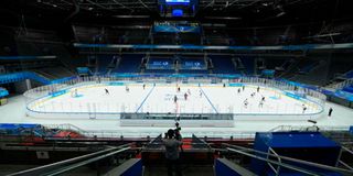 Members of Beijing Arcfox take part in an ice hockey training session during a 2022 Beijing Winter Olympic Games test event, at the National Indoor Stadium in Beijing on November 11, 2021.