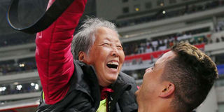 This photo taken on November 26, 2017 shows Shanghai Shenhua's Giovanni Moreno (right) lifting up photographer Hong Nanli, 79, after the Chinese FA Cup match between Shanghai Shenhua and SIPG in Shanghai. PHOTO | AFP