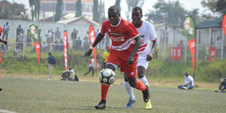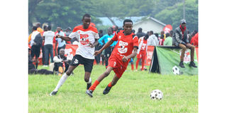 Isse Mohammed Aden of North Eastern's Boys Town (right) vies for the ball with Kilonzi Daniel of Machakos Boys during the Under-16 category of the Coca Cola Kenya Secondary School Sports Association (KSSSA) Term Two games at Kisumu Polytechnic grounds, Kisumu on July 31, 2019.