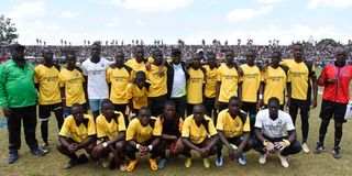 St Anthony’s Boys High School from Rift Valley Region, their coach Peter Mayoyo (left), before their boys' football final match against and Dagoreti High School from Nairobi Region at the Kenya Secondary Schools Sports Association Term Two Ball Games at Bukhungu Stadium in Kakamega County on August 12, 2023. St Anthony’s won 2-0.