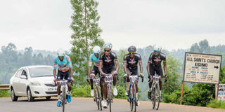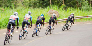 Bike Aid and Kenyan riders teams approaching the homestretch during the Madaraka Day Challenge race on the Aberdare Ranges on June 1, 2019. PHOTO | TONNY GITHINJI |