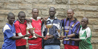 Kamiti Prison Football Club players Salim Eric, Mario Magwana, Shwaib Mohammed, coach Moses Opula, Tedium Rodgers and Benson Madara pose with there trophies after training session on September 6, 2017 at the prison grounds. PHOTO | FILE | NATION MEDIA GROUP