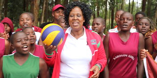 Kaboson Girls Secondary School Principal Beatrice Koech celebrates with her players after winning the volleyball title during Bomet Secondary Schools Term Two 'B' Games at Kaplong Primary School grounds on July 14, 2023.They beat Cheptalal Girls Secondary School 3-0 in the final.