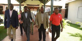 National Olympic Committee of Kenya (NOC-K) President Paul Tergat (second right) welcomes Sports Cabinet Secretary Ababu Namwamba to a strategy meeting for the Paris 2024 Olympic Games in Nakuru on May 25, 2023. NOC-K Secretary General Francis Mutuku (left) and Athletics Kenya President Jack Tuwei (second left) look on.