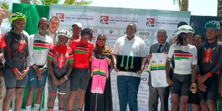 Sports Cabinet Secretary Salim Mvurya poses with some of the the team Kenya cyclists while displaying the medals to be won at Swahili Beach Resort in Diani, Kwale County on November 19 2025. He said the government had invested Sh250 million to host the championship.
