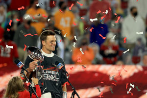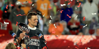 Tom Brady #12 of the Tampa Bay Buccaneers hoists the Vince Lombardi Trophy after winning Super Bowl LV at Raymond James Stadium on February 07, 2021 in Tampa, Florida. The Buccaneers defeated the Chiefs 31-9.