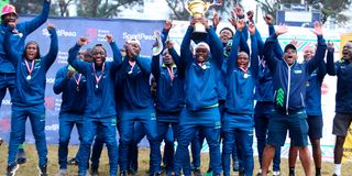 KCB Rugby Captain Bob Muhatia leads teammates in celebration while lifting Christie 7s Main Cup on 17th August 2025 during Kenya Rugby Union 7s series Christie 7s Rugby tournament played at RFUEA ground.