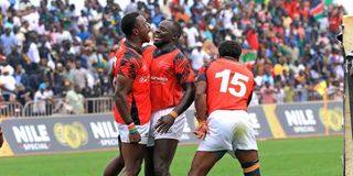 Kenya Simbas players celebrate their 2027 Rugby World Cup qualifier quarter-final victory against Uganda in Kampala on Tuesday. Kenya face Zimbabwe in the semi-final today at the same venue.