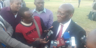 Richard Omwela addressing the media after retaining his position as the Kenya Rugby Union chairman on March 22, 2017. PHOTO | AYUMBA AYODI | NATION MEDIA GROUP