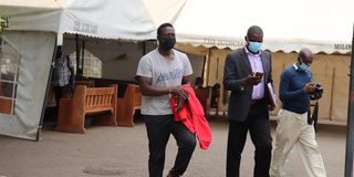 Ex-rugby player Alex Olaba (left) arrives at Milimani Court on May 4, 2021.