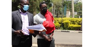 Ex-rugby player Alex Olaba in hand cuffs at the Milimani Court on May 4, 2021.