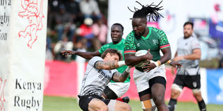Kenya Simbas' Walter Okoth charges past UAE's Max Johnson during their rugby friendly match at RFUEA ground on May 24, 2025.
