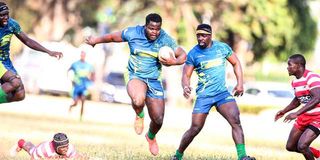 KCB’s rampaging prop Erick Miheso charges into Impala territory as teammate Felix Ojow watches during their Kenya Cup match at KCB Sports Club, Ruaraka in Nairobi. KCB won 64-14.