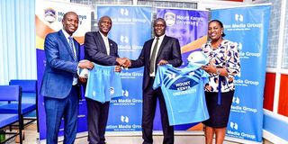 Nation Media Group (NMG) General Manager Commercial and Advertising James Sogoti (second right) hands over a NMG sponsored rugby t-shirt to Mount Kenya University (MKU) Vice-Chancellor Prof. Deogratius Jaganyi (second left) at MKU Nairobi Campus on January 30, 2024. With them is MKU Nairobi Campus Dean of Students Martin Muiruri (left) and NMG Commercial Manager Mercy Kamunya.