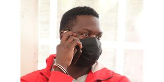 Former rugby player Alex Olaba makes a call when he appeared before a Milimani court on May 3, 2021. The prosecution has applied for Olaba's bail to be cancelled after he allegedly threatened the key witness in a rape case. The prosecution says he should be remanded at Industrial Area remand until the conclusion of the trial.