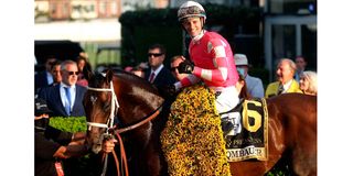 Jockey Flavien Prat #6 aboard Rombauer celebrates after winning the 146th Running of the Preakness Stakes at Pimlico Race Course on May 15, 2021 in Baltimore, Maryland.