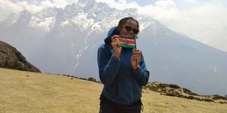 Dr Faith Mwende displays the flag of one of her sponsors – Makueni County Government – as she does small hikes of 100-metre to the Everest view point and back to Namche, Nepal, on April 19, 2023.