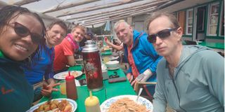 Dr Faith Mwende and fellow climbers enjoy their dinner at Namche, Nepal, on April 20, 2023.