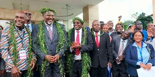 National Olympic Committee of Kenya president-elect Shadrack Maluki (second left) leads his team in celebrations after NOCK elections on July 21, 2025 in Nairobi