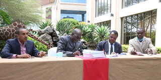 From Left: Football Kenya Federation (FKF) presidential aspirants Twaha Mbarak, Sammy Shollei, Nicholas Musonye, and Lordvick Aduda during the signing of a pre-election pact under a coalition dubbed "Super Alliance" at a Nairobi hotel on July 14, 2020.
