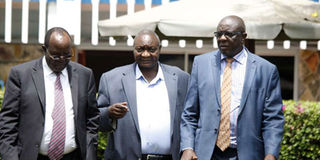 FKF presidential aspirants Sam Nyamweya (left), Alex Ole Magelo and Moses Akaranga (right) after addressing a press conference on October 30, 2019 at a Nairobi hotel.