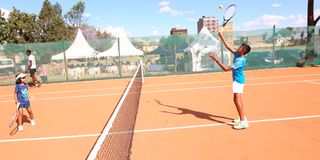 Aylin Quadros (left) and Ayaan Quadros playing tennis during the opening ceremony of the refurbished Goan Institute Tennis Courts at Pangani in Nairobi on November 3,2024.