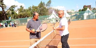 Tennis players Anil Arora(left) and Dr Goman Mohamed during the launch of the refurbished Goan Institute Tennis Courts at Pangani in Nairobi on November 3, 2024.