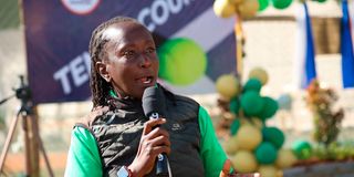 Tennis coach Rosemary Owino speaks during the launch of the refurbished Goan Institute Tennis Courts at Pangani in Nairobi on November 3, 2024.