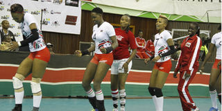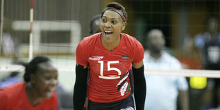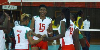 Kenya's volleyball team captain Brackcides Agala (centre), celebrates a point with setter Jane Wacu (left) and attacker Mercy Moim during a past match.