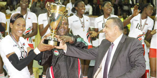 The national women's volleyball team skipper Brackcides 'Blackie' Agala (left) receives the Africa Nations Championships trophy from FIVB President Ary S. Graça (right) and Sports Hassan Cabinet Secretary Hassan Wario after their win over Algeria at the Safaricom Indoor Arena on June 20, 2015.