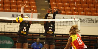 Kenya middle blockerTrizah Atuka (left) and Veronica Adhiambo block an attack from Burkina Faso’s Christine Sanou during their Africa Nations Championship Pool ‘B’ match against Burkina Faso at Palais Polyvalent des Sports (Paposy) Arena in Yaounde, Cameroon on August 17, 2023.