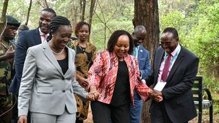 From left: Environment and Forestry Cabinet Secretary Soipan Tuya, Council of Governors chairperson Anne Waiguru and NMG chairman Dr Wilfred Kiboro at Karura Forest where they planted trees before the start of Kusi Ideas Festival 2022.